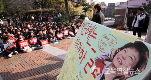 ¡¼±¤ÁÖ=±³À°¿¬ÇÕ´º½º¡½¹Ú»ó¿õ ±âÀÚ= ±¤ÁÖ±³À°´ëÇб³ ÇлýµéÀÌ 25ÀÏ ¿ÀÈÄ ºÏ±¸ dzÇ⵿ ±¤ÁÖ±³´ë Çлýȸ°ü ¾Õ¿¡¼ ±¹Á¤³ó´Ü »çÅ¿¡ ´ëÇÑ Ã¥ÀÓÀ» ¹°À¸¸ç ¹Ú±ÙÇý ´ëÅë·É ÅðÁøÀ» Ã˱¸ÇÏ´Â µ¿¸ÍÈÞ¾÷ Áýȸ¸¦ ¿¾ú´Ù