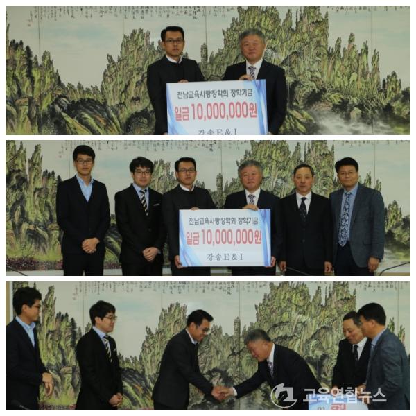 ÀåÇбâ±ÝÀ» Àü´ÞÇÑ °¼ÛE&I Á¤¸¸È£ ´ëÇ¥´Â ¡°Àü³²¿¡¼ »ç¾÷À» Çϰí ÀÖ´Â ¸¸Å Áö¿ªÇлýµéÀÌ ²ÞÀ» ÆîÄ¡´Âµ¥ Á¶±ÝÀ̳ª¸¶ µµ¿òÀÌ µÇ±æ ¹Ù¶õ´Ù¡±¸ç ¡°Àü³²±³À° ¹ßÀüÀ» À§ÇØ ÀÎÀ縦 À°¼ºÇÏ´Â ¹Ø°Å¸§À¸·Î ¾²ÀÌ±æ ¹Ù¶õ´Ù¡±°í ±âŹÀǻ縦 ¹àÇû´Ù.