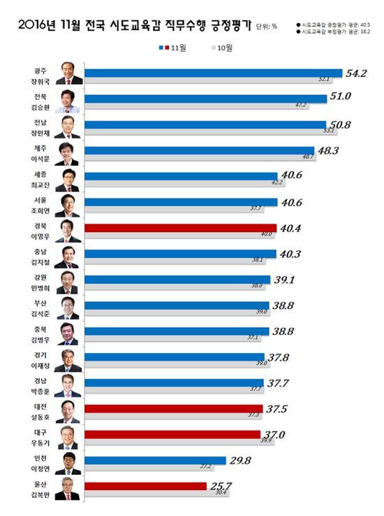 ÀåÈÖ±¹ ±³À°°¨Àº 11¿ù Àü±¹ ½Ãµµ±³À°°¨ Á÷¹«¼öÇà ÁöÁöµµ¿¡¼ 10¿ù ´ëºñ 2.1%p »ó½ÂÇϸç 54.2%ÀÇ ÁöÁöÀ²·Î 1À§¸¦ ±â·ÏÇß´Ù. ±è½Âȯ ÀüºÏ±³À°°¨Àº 51.0%·Î 2À§, À常ä Àü³² ±³À°°¨Àº 50.8%·Î 3À§¸¦ Â÷ÁöÇß´Ù.