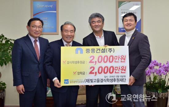 ¡¼±¤ÁÖ=±³À°¿¬ÇÕ´º½º¡½¹Ú»ó¿õ ±âÀÚ= ÁßÈï°Ç¼³(»çÀå Á¤¿øÁÖ)ÀÌ ¿¬¸»¿¬½Ã »çȸ°øÇåȰµ¿ ÀÏȯÀ¸·Î 13ÀÏ ½Ã±³À°Ã» ±³À°°¨½Ç¿¡¼ ±¤ÁÖ±¤¿ª½Ã±³À°Ã»(±³À°°¨ ÀåÈÖ±¹)°ú ºû°íÀ»°á½ÄÇлýÈÄ¿øÀç´Ü¿¡ °ü³» Áß¡¤°íµîÇлý ÀåÇÐ±Ý 2000¸¸ ¿ø°ú °á½ÄÇлýÀ» À§ÇÑ ÈÄ¿ø±Ý 2000¸¸ ¿øÀ» Àü´ÞÇß´Ù.