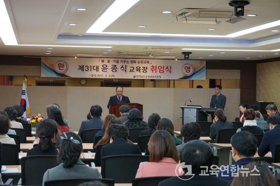 ½ÅÀÓ À± ±³À°ÀåÀº ÃëÀӻ縦 ÅëÇØ¡°¹Ì·¡Çٽɿª·® ÇÔ¾çÀ» À§ÇØ ¹è¿òÀ» Áñ±â¸ç ²Þ°ú ³¢¸¦ Ű¿ì´Â Çлý, ±àÁö¿Í º¸¶÷À» ´À³¢¸ç ¿Á¤À¸·Î °¡¸£Ä¡´Â ±³Á÷¿ø, °ü½É°ú Âü¿©·Î ¼øÃµ±³À°À» ½Å·ÚÇÏ´Â Çкθð, ¼ÒÅë°ú Çù·ÂÀ¸·Î µ¿ÇàÇÏ´Â Áö¿ª»çȸ, ±³À° °øµ¿Ã¼ ¸ðµÎÀÇ ÁöÇý¿Í ¿ª·®À» ¸ð¾Æ ´õºÒ¾î ÇÔ²²ÇÏ´Â ±³À°À» ½ÇÇöÇϱâ À§ÇØ ÃÖ¼±ÀÇ Áö¿øÀ» ÇϰڴÙ"°í ¸»Çß´Ù.