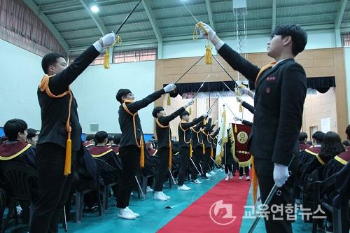 ¹®Å°íµîÇб³ Á¹¾÷½Ä, ±× Á߽ɿ¡´Â Ç×»ó ¡®Çлý¡¯ÀÌ ÀÖ´Ù. 1,2Çгâ ÀçÇлýµéÀÌ ÀÚ¹ßÀûÀ¸·Î ¿¹µµ´ÜÀ» ±¸¼ºÇÏ¿© ÀÔÀå°ú ÅðÀå ½Ã ¿¹µµÀǽÄÀ» ÁøÇàÇϰí, Á¹¾÷»ýµéÀº Á¹¾÷ °¡¿îÀ» ¸ðµÎ Âø¿ëÇÏ°í ¸ðµç ±³Á÷¿ø°ú Çкθð, ÈĹèµéÀÇ ÃàÇϸ¦ ¹ÞÀ¸¸ç ¹«´ë¿¡ ¿Ã¶ó Á¹¾÷ÀåÀ» ¹Þ´Â´Ù.