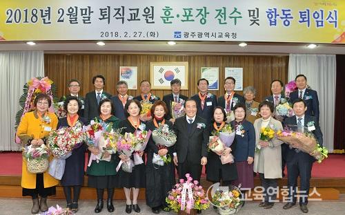 ¡¼±¤ÁÖ=±³À°¿¬ÇÕ´º½º¡½¹Ú»ó¿õ ±âÀÚ= ±¤ÁÖ±¤¿ª½Ã±³À°Ã»(±³À°°¨ ÀåÈÖ±¹)ÀÌ 27ÀÏ ¿ÀÀü10½Ã ´ëȸÀǽǿ¡¼ ÅðÀÓ±³¿ø°ú µ¿·á±³¿ø, °¡Á· Ä£Áö µî 200¿© ¸íÀÌ Âü¼®ÇÑ °¡¿îµ¥ '2018³âµµ 2¿ù¸» ÅðÁ÷±³¿ø ÈÆ‧Æ÷Àå Àü¼ö ¹× ÇÕµ¿ ÅðÀÓ½Ä'À» °³ÃÖÇß´Ù.
