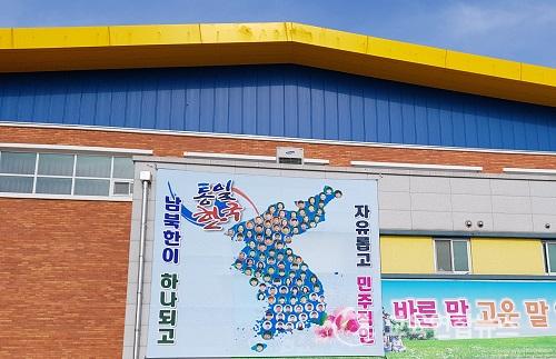 ¸ÕÀú ÅëÀÏ¿¡ ´ëÇÑ °ü½ÉÀ» ³ôÀ̰íÀÚ ±³½Ç Àü¸é Çб޼Ұ³ÆÇÀ» Çѹݵµ±â·Î Á¦ÀÛÇÏ¿´°í °´ç¿Üº®¿¡ ´ëÇü ÅëÀϱ⸦ °É¾î Çб³»ýȰ Áß ´Ã Çѹݵµ±â¸¦ º¼ ¼ö ÀÖ°Ô ÇÏ¿´´Ù.