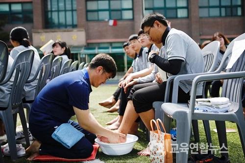 µ¿¸í°íµîÇб³´Â 15ÀÏ ¿ÀÀü 10½Ã ½º½ÂÀÇ ³¯ ¼¼Á·½Ä Çà»ç¸¦ ÁøÇàÇß´Ù. À̳¯ ±³»çµéÀº ¹æ¼®À§¿¡ ¹«¸ ²Ý°í ¾É¾Æ ¼¼¼ý´ë¾ß¿¡ ´ã±ä ¹°·Î Çлý ¹ßÀ» ¾Ä±ä ÈÄ ¼ö°ÇÀ¸·Î ´Û¾ÆÁØ´Ù. ±³»çµéÀº ¹ßÀ» ¾Ä¾îÁÖ¸é¼ ÄªÂù°ú °Ý·ÁÀÇ ¸»À» ÇØÁÖ°í ¾ÄÀº ÈÄ ¹Ì¸® ÁغñÇÑ ¿±¼¸¦ Àü´ÞÇÑ´Ù. ¿±¼¿£ ÇлýµéÀ» ÇâÇÑ »ç¶û°ú °Ý·ÁÀÇ ¸Þ½ÃÁö°¡ ´ã°ÜÀÖ´Ù.