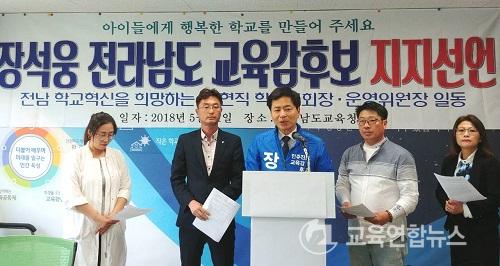 °°Àº ³¯ ¿ÀÈÄ 2½Ã 'Àü³² Çб³Çõ½ÅÀ» Èñ¸ÁÇÏ´Â Àü¡¤ÇöÁ÷ ÇкθðȸÀ塤¿î¿µÀ§¿øÀå 115¸íµµ Àü³²µµ±³À°Ã» ºê¸®ÇÎ ·ë¿¡¼ Àå¼®¿õ Èĺ¸ ÁöÁö¼±¾ðÀ» Çß´Ù. Àڳฦ ¹«Áö°³Çб³¿¡ º¸³Â´ø 115¸íÀÇ Çкθð ´ëÇ¥·Î ±¸¼ºµÈ À̵éÀº ¡°Àå È帴 Àü±³Á¶ À§¿øÀåÀ» ¸¶Ä£ µÚ ´õ ³ô°í Æí¾ÈÇÑ ÀÚ¸®°¡ ¾Æ´Ñ Æò±³»ç·Î Çб³¿¡ µ¹¾Æ¿Í ¾ÆÀ̵éÀ» °¡¸£Ä¡¸ç Á¤³âÅðÀÓÇÑ Á¸°æ¹Þ´Â ¼±»ý´ÔÀ̾ú´Ù¡±¸ç ¡°¡®¾ÆÀ̵éÀÌ ÇູÇÑ Çб³¡¯¸¦ Àå¼®¿õ Èĺ¸¿Í ÇÔ²² ¸¸µé¾î°¡°Ú´Ù¡±°í ¹àÇû´Ù.