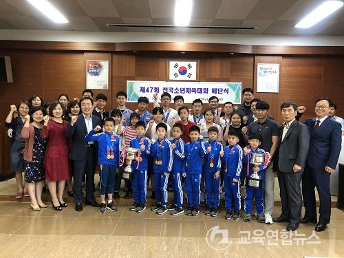 ÇØ´Ü½Ä¿¡¼­ Àü±¹¼Ò³âüÀ°´ëȸ¿¡ ¿ì¼öÇÑ ¼ºÀûÀ» °ÅµÖ ÀÔ»óÇÑ ¸ðµç ¼±¼ö¿Í ¿îµ¿ºÎ¿¡°Ô °Ý·Á±ÝÀ» Áö±ÞÇÏ¿© ±×µ¿¾ÈÀÇ ³ë·ÂÀÇ °á°ú¸¦ °á½Ç·Î °ÅµÎ°Ô µÈ °Í¿¡ ´ëÇØ ±×°£ÀÇ ³ë°í¸¦ Ä¡ÇÏÇÏ¿´´Ù.