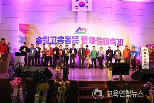 ¼Û¿ø°íµîÇб³ Ãѵ¿¹®È¸(ȸÀå ¹ÚÁ¤Áø) ÇѸ¶À½ ´ëÃàÁ¦°¡ Áö³­ 21ÀÏ ¸ð±³¿îµ¿Àå ¹× Ã¼À°°ü¿¡¼­ ¼ºÈ²¸®¿¡ °³Ãֵƴ٠(¼Û¿ø°í Ãѵ¿¹®È¸ ¿ª´ë ȸÀå´ÜÀ» ºñ·ÔÇÑ ÀÓ¿øÁøµéÀÇ ±â³ä ÃÔ¿µ Àå¸é)
