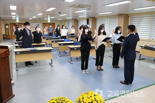 ±èÁ¤Èñ ±³À°ÀåÀº ¡°Ã»·ÅÇÑ ÀÚ¼¼·Î ¿Ã¹Ù¸¥ °øÁ÷°üÀ» È®¸³ÇÏ¿© ½Å·Ú¹Þ´Â °øÁ÷ÀÚ°¡ µÇ¾î¾ß ÇÑ´Ù¡±°í ¸»ÇÏ¸é¼ ¡°´Ù¾ç¼º°ú À¯¿¬¼º ¹× âÀǼºÀ» °ÈÇÏ°í ³»Àû ¼ºÀåÀ» À̲ø¾î³»´Â ±³À°°úÁ¤ ¿î¿µÀ» Áö¿øÇϴµ¥ ¿©·¯ºÐÀÌ Èû½á Áֱ⸦ ¹Ù¶õ´Ù¡±°í ´çºÎÇß´Ù.