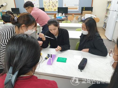 ½ÇÇè½Ç¿¡ ÇÔ²² Âü°¡ÇÑ ¾à»ê°í °úÇб³»ç´Â ¡°Æò¼Ò¿¡ °úÇÐ ½ÇÇè ¼ö¾÷¿¡ ´ëÇÑ ºÎ´ã°¨(¼ö¾÷ÀÇ ÁýÁßµµ, °úÇÐ ±â±â ±¸¸Å µî)ÀÌ ÀÖ¾ú´Âµ¥ ÇлýµéÀÌ °æÇèÇßÀ» ¶§ ÀÇ¹Ì ÀÖ´Â ³»¿ëÀÇ »ý¸í°úÇÐ ½ÇÇèÀ» Çб³¿¡ Á÷Á¢ ã¾Æ¿Í ÁøÇàÇÑ´Ù´Â °ÍÀ» º¸°í Âü¿©ÇÏ°Ô µÇ¾ú´Ù.¡±¶ó°í ¸»ÇßÀ¸¸ç ¡°¸¶ÀÌÅ©·Î ÇÇÆêÀ̶ó´Â ¿ë¾î¸¦ ¾î·Æ°Ô¸¸ »ý°¢Çß´ø ÇлýµéÀÌ Á÷Á¢ »ç¿ëÇÏ´Â ¹æ¹ýÀ» ¹è¿ì°í ±³°ú¼¿¡ ÇØ´ç ¿ë¾î°¡ ³ª¿ÀÀÚ ¸ÕÀú Ä£±¸µé¿¡°Ô ¼Ò°³ÇÏ´Â ¸ð½ÀÀ» º¸°í »ý¸í°úÇÐ ºÐ¾ß¿¡ ÁøÇÐÇϰíÀÚ ÇÏ´Â ÇлýµéÀÌ »ý°å´Ù.¡±¶ó¸ç ½ÇÇè½Ç Âü¿© ÈÄ ÇлýµéÀÇ ´Þ¶óÁø ŵµ¸¦ º¸¾ÒÀ» ¶§ ¡°±³»çÀÇ ¿ ¸¶µð ¼³¸íº¸´Ù Á÷Á¢ Âü¿©ÇÑ ½ÇÇèÀÌ °ªÁø °æÇèÀÌ µÉ ¼ö ÀÖ´Ù´Â °ÍÀ» ´À²¼´Ù.¡±¶ó°í ¼Ò°¨À» ÀüÇß´Ù.