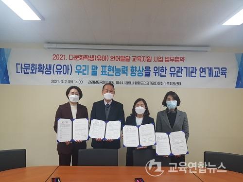 Àü³²´Ù¹®È­±³À°Áö¿ø¼¾ÅÍ´Â 2ÀÏ 3°³ Áö¿ª(¿©¼ö, ±¤¾ç, ÇÔÆò) °Ç°­°¡Á¤¡¤´Ù¹®È­°¡Á·Áö¿ø¼¾ÅÍ¿Í ´Ù¹®È­Çлý(À¯¾Æ) ¾ð¾î¹ß´Þ ±³À°Áö¿ø »ç¾÷ Çù¾à½ÄÀ» °¡Á³´Ù.