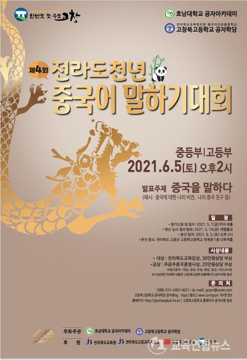 ¡®Áß±¹À» ¸»ÇÏ´Ù¡¯¶ó´Â ÁÖÁ¦·Î ¿­¸®´Â À̹ø ´ëȸ¿¡ Âü°¡ Èñ¸ÁÀڴ ȣ³²´ëÇб³ °øÀÚ¾ÆÄ«µ¥¹Ì ȨÆäÀÌ(https://gongja.honam.ac.kr/), °íâºÏ°íµîÇб³ ȨÆäÀÌÁö(https://school.jbedu.kr/gochangbuk-h)¸¦ ÂüÁ¶ÇØ ´ÙÀ½´Þ 7ÀϱîÁö ¿¹¼± Âü°¡½Åû¼­¿Í ¹ßÇ¥ ¿ø°í(Áß±¹¾î¡¤Çѱ¹¾î °¢ 1ºÎ), ¹ßÇ¥ ÃÔ¿µ ¿µ»ó ÆÄÀÏ µîÀ» À̸ÞÀÏ·Î Á¦ÃâÇÏ¸é µÈ´Ù. ¿¹¼± ½É»ç¹ßÇ¥´Â 5¿ù 14ÀÏ °³º° Å뺸µÇ¸ç 6¿ù 5ÀÏ °íâºÏ°íµîÇб³ ±¹Á¦°ü¿¡¼­ º»¼±ÀÌ ½Ç½ÃµÈ´Ù.