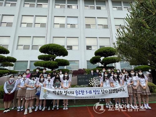 Àü³²¿©»ó ÃÖ±Ô¸í ±³ÀåÀº ¡°Àü³²¿©»óÀº ±³³» Çà»ç»Ó¸¸ ¾Æ´Ï¶ó ¸Å³â 5¿ù 5¡¤18 ±¹¸³ ¹ÎÁÖ ¹¦Áö¸¦ ã¾Æ Âü¹è¿Í ÇÔ²² ¹ÎÁÖÁ¤½ÅÀ» °è½ÂÇϰí ÀÖ´Ù¡±¸ç ¡°¿ÃÇØ´Â °í(ͺ) ¹Ú±ÝÈñ ¿»ç¸¦ ±â¸®´Â ¸¶À½À» ´ã¾Æ ±³³» µðÀÚÀÎ °ø¸ð¸¦ ÅëÇØ ¹èÁö¸¦ Á¦ÀÛÇØ Èñ»ýÀÚµéÀÇ ¼þ°íÇÑ ¹ÎÁÖ ÀúÇ× Á¤½ÅÀ» ±â·È°í, ¾ÕÀ¸·Îµµ ¿ì¸® ÇлýµéÀÌ ¿À´ÃÀÇ °¨»çÇÔÀ» ÀØÁö ¾Êµµ·Ï ´Ù¾çÇÑ ±³À° Ȱµ¿À» ÆîÃÄ ³ª°¡°Ú´Ù¡±°í ¹àÇû´Ù.
