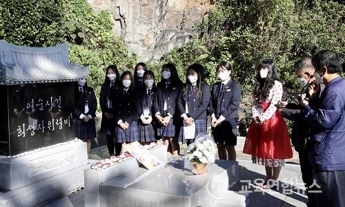Á¦ÁÖ ÇѸ²¿©ÀÚÁßÇб³ 2Çгâ Á¤Àº°æ ÇлýÀº 18ÀÏ(¿ù) ¿©¼ö½Ã ¸¸¼º¸®¿¡ ÀÖ´Â ¿©¼ö¡¤¼øÃµ10¡¤19 Èñ»ýÀÚ À§·Éºñ ¾Õ¿¡¼ 73³â Àü ±×³¯ÀÇ ºñ±ØÀ» ¶°¿Ã¸®¸ç ¸Ó¸®¸¦ ¼÷¿´´Ù. Á¤Àº°æ ÇлýÀº ¡°´Ù½Ã´Â ÀÌ ¶¥¿¡ ±×¿Í °°Àº ºñ±ØÀÌ ÀϾÁö ¾Êµµ·Ï ¿½ÉÈ÷ °øºÎÇÏ°í ¼ºÀåÇØ¼ ÆòÈ¡¤ÀαÇÀÇ °¡Ä¡¸¦ µå³ôÀÌ´Â ¼¼´ë°¡ µÇ°Ú´Ù.¡±°í ´ÙÁüÇß´Ù.
