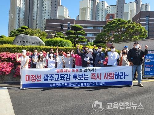 ±¤ÁÖ Á¤ÀÇ·Î¿î ±³À°°¨ ¸¸µé±â ÇùÀÇȸ(ȸÀå ÀÓµ¿È¯)´Â 27ÀÏ ¿ÀÈÄ 4½Ã ±¤Áֽñ³À°Ã» ¾Õ¿¡¼ ±âÀÚȸ°ßÀ» °®°í ¡°ÀÌÁ¤¼± ±¤Áֽñ³À°°¨ È帰¡ Áö³ 2018³â ½Ç½ÃµÈ ±³À°°¨ ¼±°Å¿Í °ü·ÃÇØ ´ç½Ã ¼±´ëº»ºÎÀåÀÎ A¾¾ÀÇ ¼±°Å¹ý À§¹Ý¿¡ µû¸¥ ¹ú±ÝÀ» ´ë³³ÇÑ ÀÇȤÀÌ ÇÑ À¯Æ©ºê ¹æ¼ÛÀ» ÅëÇØ °ø°³µÈ ¹Ù ÀÖ´Ù¡±¸ç ¡°ÀÌ¿¡ ´ëÇØ ÀÌÁ¤¼± È帴 ¸íÈ®ÇÑ »ç½Ç°ü°èÀ» ÇØ¸íÇ϶󡱰í ÁúŸÇß´Ù.