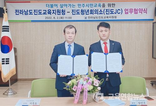 Àü¶ó³²µµÁøµµ±³À°Áö¿øÃ»(±³À°Àå À̹®Æ÷)Àº 8¿ù 2ÀÏ(È) ÁøµµÃ»³âȸÀǼÒ(ȸÀå ¾ç¼±¿ì)¿Í Âü¿©¿Í ½ÇõÀÇ ¹ÎÁֽùα³À° ¹× Áö¼Ó °¡´É »ýÅ ȯ°æ±³À°À» À§ÇÑ ¾÷¹«Çù¾àÀ» ü°áÇß´Ù.