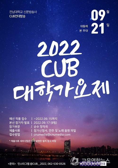 Àü³²´ë ½Å¹®¹æ¼Û»ç(ÁÖ°£ Á¤°æ¿î ±³¼ö)´Â 9¿ù 21ÀÏ ¿ÀÈÄ 6½Ã 30ºÐºÎÅÍ ¿ëºÀ´ëµ¿Ç®ÀÌ Æ¯¼³¹«´ë¿¡¼ ¡®CUB ´ëÇа¡¿äÁ¦¡¯(¿¾ ¿ëºÀ°¡¿äÁ¦)¸¦ °³ÃÖÇÑ´Ù. À̳¯ °¡¿äÁ¦¿¡´Â º»¼±¿¡ ¿À¸¥ ´ëÇлý°ú ÀϹÝÀÎ 8ÆÀÀÌ ¼ø¼ö âÀÛÇÑ À½¾ÇÀ¸·Î ½Ç·ÂÀ» °Ü·ç¸é¼, °ÇÀüÇÑ ´ëÇй®È Á¶¼º°ú ÇÔ²² ÃàÁ¦ºÐÀ§±â¸¦ °íÁ¶½ÃŲ´Ù.