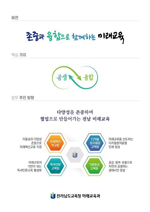 ¡®Á¸Áß°ú À¶ÇÕÀ¸·Î ÇÔ²²ÇÏ´Â ¹Ì·¡±³À°¡¯À» ºñÀüÀ¸·Î ³»°É°í, ¡®°ø»ý¡¯°ú ¡®À¶ÇÕ¡¯À» ÇÙ½É °¡Ä¡·Î, ¡®´Ù¾ç¼ºÀ» Á¸ÁßÇϸç Çù¾÷À¸·Î ¸¸µé¾î°¡´Â Àü³² ¹Ì·¡±³À°¡¯À» ¾÷¹« ÃßÁø¹æÇâÀ¸·Î ¼³Á¤Çß´Ù. ÆÀº° ¾÷¹« ÃßÁø ¹æÇâÀ» º¸¸é, ¹Ì·¡Çõ½ÅÇб³ÆÀÀº ÀÚÀ²¼º°ú ´Ù¾ç¼º Á¸ÁßÀ¸·Î ¹Ì·¡Çõ½Å±³À° Áö¿ø, µðÁöÅÐâÀÇÀ¶ÇÕ±³À°ÆÀÀº ¹Ì·¡±³À°À» ¼±µµÇÏ´Â µðÁöÅÐâÀÇÀ¶ÇÕÀÎÀç ¾ç¼º, µ¶¼Àι®±³À°ÆÀÀº ¹Ì·¡±³À°ÀÇ ±â¹ÝÀÌ µÇ´Â µ¶¼Àι®±³À° Ȱ¼ºÈ, ±âÈÄȯ°æ±³À°ÆÀÀº °ø°£‧Âü¿©‧Æ÷¿ëÀ¸·Î ÀÚ¿¬°ú °ø»ýÇÏ´Â »ýŽùΠ¾ç¼º µîÀÌ´Ù.