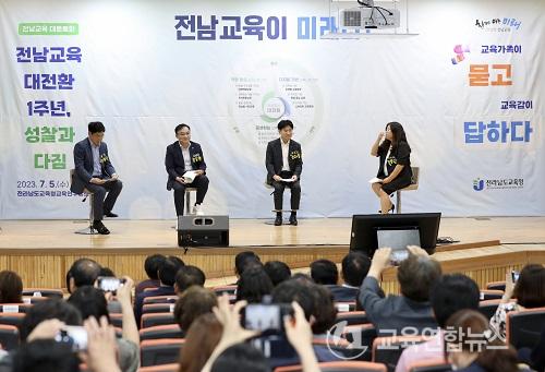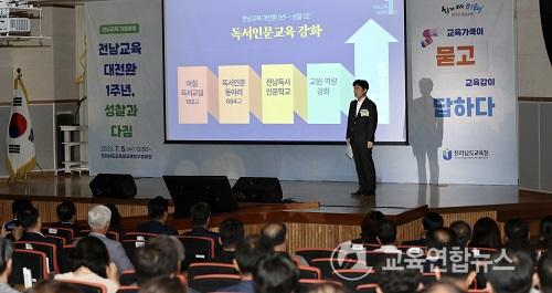 Àü¶ó³²µµ±³À°Ã»(±³À°°¨ ±è´ëÁß)ÀÌ ÁÖ¹ÎÁ÷¼± 4±â ±è´ëÁß ±³À°°¨ ÃëÀÓ 1ÁÖ³âÀ» ¸Â¾Æ 7¿ù 5ÀÏ(¼ö) Àü¶ó³²µµ±³À°Ã»±³À°¿¬±¸Á¤º¸¿ø¿¡¼­ ¸¶·ÃÇÑ ¡®Àü³²±³À° ´ëÅä·Ðȸ¡¯ Âü¿©ÀÚµéÀº Àü³²±³À° ´ëÀüȯ Á¤Ã¥ ½ÇÇö °úÁ¤¿¡¼­ ±³À°°øµ¿Ã¼µéÀÇ ÀÇ°ß ¼ö·Å°ú ¹Ý¿µÀÌ Áß¿äÇÏ´Ù´Â µ¥ ÇѸñ¼Ò¸®¸¦ ³Â´Ù.
