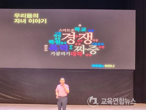 ¹Ú±³ÀåÀº À̹ø ÅäÅ©Èú¸µ °ø¿¬À» ÅëÇØ ¡°ÇöÀç ¿ì¸® ÀÚ³àµéÀº Çб³Æø·Â°ú »çÀ̹ö ¿Õµû, °ÔÀÓÁßµ¶, ¸¶¾à, ÀÚ»ì µîÀ¸·Î ½Ã´Þ¸®°í ÀÖ´Ù¡±¸é¼­¡° ù°, ¹ÏÀ½À» °®°í ¼ÒÅëÇÏÀÚ. µÑ°, Â÷º°À» ÇÏÁö ¸»ÀÚ ¼Â°, ºÎÁ¤ÀûÀÎ ½Ã°¢º¸´Ù ±àÁ¤ÀÇ ÈûÀ¸·Î Èñ¸ÁÀ» ¸»Çضó. ³Ý°, ¾ÆÀÌÀÇ Àû¼ºÀ» ¾Ë°í °á ´ë·Î Ű¿ö¶ó.µîÀ» ¼Ò°³ Çϸç, ¾ÆÀÌ¿¡ ´ëÇÑ È¯°æÀ» ÀÌÇØÇÏ°í ¾ÆÀÌÀÇ ´«³ôÀÌ¿¡¼­ ´Ù°¡¼­´Â °ÍÀÌ Áß¿ä ÇÏ´Ù¡±°í ¸Þ½ÃÁö¸¦ Àü´ÞÇß´Ù.