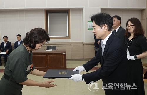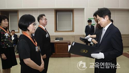 | | ±è´ëÁß Àü³²±³À°°¨(¿À¸¥ÂÊ)ÀÌ 8¿ù 28ÀÏ µµ±³À°Ã» ´ëȸÀǽǿ¡¼ 2023³â 8¿ù¸» ÅðÁ÷ ±³¿ø¿¡°Ô Á¤ºÎ ÈÆÆ÷ÀåÀ» Àü¼öÇϰí ÀÖ´Ù. |