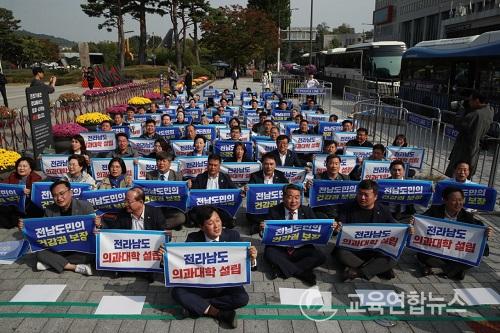 Àü¶ó³²µµÀÇȸ ¡®Àü¶ó³²µµ Àǰú´ëÇÐ À¯Ä¡ ´ëÃ¥À§¿øÈ¸¡¯(°øµ¿À§¿øÀå ÃÖ¼±±¹ º¸°Çº¹Áöȯ°æÀ§¿øÀå, ½Å¹ÎÈ£ ±âȹÇàÁ¤À§¿øÀå)´Â 10¿ù 18ÀÏ ¿ÀÈÄ 1½Ã ±¹È¸ ¼ÒÅë°ü¿¡¼ ±âÀÚȸ°ßÀ» ¿¬ µ¥ À̾î, À̳¯ ¿ÀÈÄ 2½Ã ¿ë»ê ´ëÅë·É½Ç ¾Õ ÀüÀï±â³ä°ü¿¡¼ 500¿© ¸íÀÌ Âü¼®ÇÑ °¡¿îµ¥ Áýȸ¸¦ ¿°í ¡®Àü¶ó³²µµ ±¹¸³ Àǰú´ëÇÐ ½Å¼³¡¯À» Ã˱¸Çß´Ù.