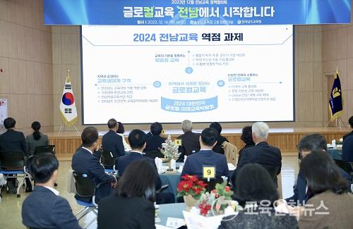 22°³ ½Ã¡¤±º ±³À°Àå°ú 12°³ Á÷¼Ó±â°üÀå, º»Ã» °úÀå µî 60¿© ¸íÀÌ Âü¼®ÇÑ °¡¿îµ¥ ¿¸° À̳¯ ȸÀÇ¿¡¼ Âü¼®ÀÚµéÀº ¡®Àü³²±³À°ÀÌ ±Û·ÎÄñ³À°ÀÔ´Ï´Ù¡¯¸¦ ÁÖÁ¦·Î 2024³â Àü³²±³À° ÁÖ¿ä ¾÷¹«°èȹ ¹× Àü³²Çü ¹Ì·¡Çб³ ¿î¿µ ¹æÇâÀ» °øÀ¯Çß´Ù.