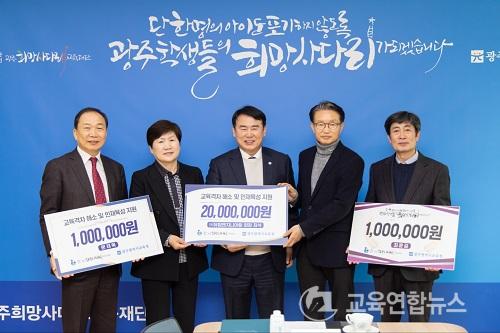 °°Àº ³¯ ½Ã±³À°Ã»ÀÌ µû¸£¸é À̹ø ±âºÎ±Ý Àü´Þ½Ä¿¡ ÀÌÁ¤¼± ±³À°°¨°ú ±è¼ºÁø ±¤ÁÖÈñ¸Á»ç´Ù¸®±³À°Àç´Ü ÀÌ»çÀåÀ» ºñ·ÔÇØ À¯Å¾¿£Áö´Ï¾î¸µ ÃÖ¼® ȸÀå, îñ¿°ÁÖÃÊ ¹®Àç¿Á ±³Àå, îñÀå´ö°í ÃÖÀ±±æ ±³Àå µîÀÌ Âü¼®ÇØ ÀÌ·ïÁ³´Ù. ÃÖ¼® ȸÀåÀº 2õ¸¸¿ø, ¹®Àç¿Á ±³Àå°ú ÃÖÀ±±æ ±³ÀåÀº À̹ø Çà»ç¸¦ ÅëÇØ °¢ 100¸¸¿øÀ» ±âºÎÇß´Ù.