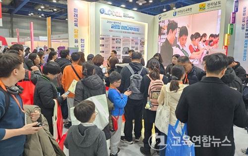 ¼­¿ï ÄÚ¿¢½º Á¦21ȸ ´ëÇѹα¹ ±³À°¹Ú¶÷ȸÀå¿¡ ¼³Ä¡µÈ ¡®2024 ´ëÇѹα¹ ±Û·ÎÄà ¹Ì·¡±³À° ¹Ú¶÷ȸ¡¯ È«º¸ ºÎ½º¸¦ ãÀº °ü¶÷°´µéÀÌ Àü³²±³À°Ã»ÀÇ ¼³¸íÀ» µè°í ÀÖ´Ù.