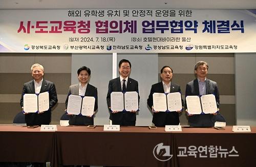 Àü¶ó³²µµ±³À°Ã»À» Æ÷ÇÔÇÑ 5°³ ½Ã¡¤µµ±³À°Ã» °ü°èÀÚµéÀÌ ¡®ÇØ¿Ü À¯Çлý À¯Ä¡ ¹× ¾ÈÁ¤Àû ¿î¿µÀ» À§ÇÑ ¾÷¹«Çù¾à¡¯ ü°á½ÄÀ» ¸¶Ä£ µÚ ÆÄÀÌÆÃÀ» ¿ÜÄ¡¸ç ±â³äÃÔ¿µÇϰí ÀÖ´Ù.