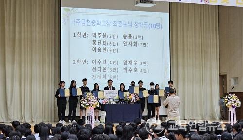29ÀÏ, ³ªÁÖ±ÝõÁßÇб³ 2Ãþ °´ç¿¡¼ ½Ç½ÃÇÑ ÃÖ±¤Ç¥±³Àå ÅðÀӽĿ¡´Â, º¯Á¤ºó³ªÁÖ±³À°ÀåÀ» ºñ·ÔÇÑ Çлý, ±³»ç, Çкθðȸ, Çб³¿î¿µÀ§¿øÈ¸, ³ªÁÖ°ü³» ±â°ü´ëÇ¥, ÃÖ±¤Ç¥±³Àå °íµîÇб³ µ¿±â»ý µîÀÌ Âü¼®ÇÑ °¡¿îµ¥ ¡°ÃÖ±¤Ç¥±³ÀåÀÇ ¼±»ý´Ô! Á¦2ÀÇ ±ÝºûÀλý¡±À» À§ÇÑ ÅðÀӽİú ÇÔ²² ³ªÁÖ±ÝõÁß Çлýµé¿¡°Ô ÀåÇбÝÀÌ ¼ö¿©µÆ´Ù.