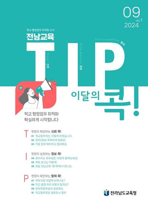 ¸ÕÀú ¡®Àü³²±³À° TIP(ÆÁ)ÄÛ¡¯Àº Çб³ ÇöÀå¿¡¼ ÇÊ¿ä·Î ÇÏ´Â Çб³¾÷¹« ÃÖÀûÈ ³»¿ëÀ» ´ã¾Æ ¸Å¿ù ÇöÀå¿¡ ¾È³»ÇÏ´Â À¥ ¼Ò½ÄÁö´Ù. ¼Ò½ÄÁö´Â T(Trust, ½Å·Ú), I(Information, Á¤º¸), P(Participation, Âü¿©) ¼¼ °¡Áö·Î ±¸¼ºµÈ´Ù.