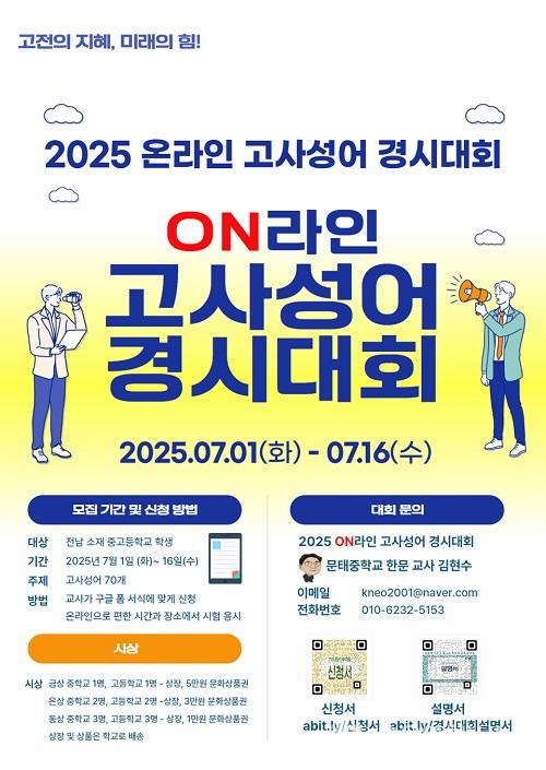 ¡¼¹«¾È=±³À°¿¬ÇÕ´º½º¡½¹Ú»ó¿õ ±âÀÚ= '°íÀüÀÇ ÁöÇý, ¹Ì·¡ÀÇ Èû!' Àü¶ó³²µµ±³À°Ã» °ü³» Áß¡¤°íµîÇлýµéÀÇ Çѹ® ½Ç·Â°ú Àι®ÇÐÀû ¼Ò¾çÀ» °íÃëÇϱâ À§ÇÑ '2025 ¿Â¶óÀÎ °í»ç¼º¾î °æ½Ã´ëȸ'°¡ ¿À´Â 7¿ù 1ÀÏ(È)ºÎÅÍ 16ÀÏ(¼ö)±îÁö 2ÁÖ°£¿¡ °ÉÃÄ °³ÃֵȴÙ.