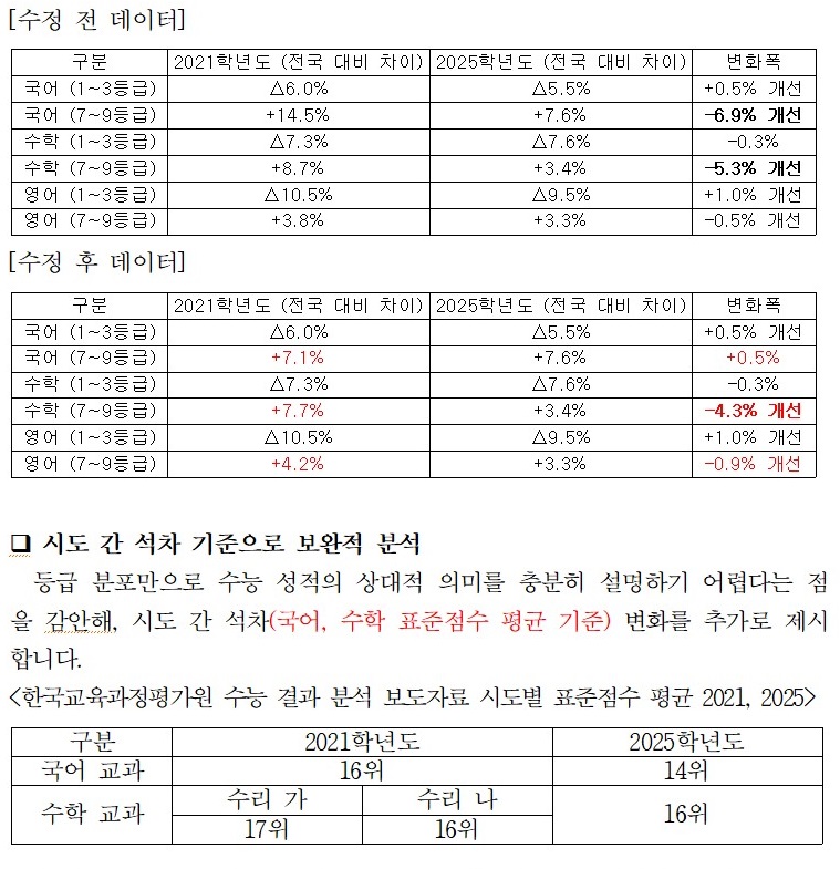 ÇØ´ç º¸µµÀÚ·á¿¡¼´Â 2021Çг⵵¿Í 2025Çг⵵ ¼ö´É ¼ºÀûÀ» ºñ±³Çϸç, Àü³² ÇлýµéÀÇ Çз ¼öÁØ Çâ»óÀ» ¼³¸íÇÑ ¹Ù ÀÖÀ¸³ª, ºÐ¼® °úÁ¤¿¡¼ ±¹¾î ±³°ú µî ÀϺΠ¿µ¿ªÀÇ µî±Þ ºÐÆ÷ ¼öÄ¡°¡ À߸ø ÀÔ·ÂµÈ »ç½ÇÀÌ µÚ´Ê°Ô È®ÀεǾú´Ù.