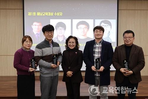 ¼ö»óÀÚµéÀº ¸ðµÎ ÇØ³²¿¡¼ 10³â ÀÌ»ó ±Ù¹«Çϸç Çб³ ÇöÀå°ú ±³À°ÇàÁ¤ °¢ ºÐ¾ß¿¡¼ Çлý ¼ºÀå°ú Çб³ ¹ßÀüÀ» À§ÇØ ²ÙÁØÈ÷ Çå½ÅÇØ ¿Â °ø·Î¸¦ ÀÎÁ¤¹Þ¾Ò´Ù. °¨»çÆÐ¿¡´Â ÇØ³²ÀÇ ¾ÆÀ̵éÀÌ ¹è¿ì°í ¼ºÀåÇÏ´Â ±æ¿¡ ±íÀº °ü½É°ú ¾ÖÁ¤À» ½ñ¾Æ ÁØ Çå½Å¿¡ ´ëÇÑ °¨»ç¿Í Á¸°æÀÇ ¸¶À½ÀÌ ´ã°å´Ù.