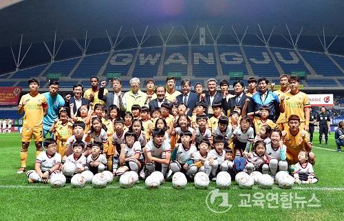 [±¤ÁÖ=±³À°¿¬ÇÕ´º½º]¹Ú»ó¿õ±âÀÚ= ±¤ÁÖ±¤¿ª½Ã±³À°Ã»(±³À°°¨ ÀåÈÖ±¹)ÀÌ 21ÀÏ ±¤ÁÖ¿ùµåÄŰæ±âÀå¿¡¼ ±¤ÁÖ±³À°°¡Á·ÀÇ ³¯ Èñ¸Á½ºÄðµ¥ÀÌ ¡®Ã౸Àå °¡´Â ³¯(±¤ÁÖFC vs ¼ö¿ø»ï¼ººí·çÀ®½º)¡¯ Çà»ç¸¦ ÁøÇàÇß´Ù. À̳¯ Çà»ç¿£ Çлý, Çкθð, ±³Á÷¿ø µî 2,500¿©¸íÀÌ Âü¿©Çß´Ù.