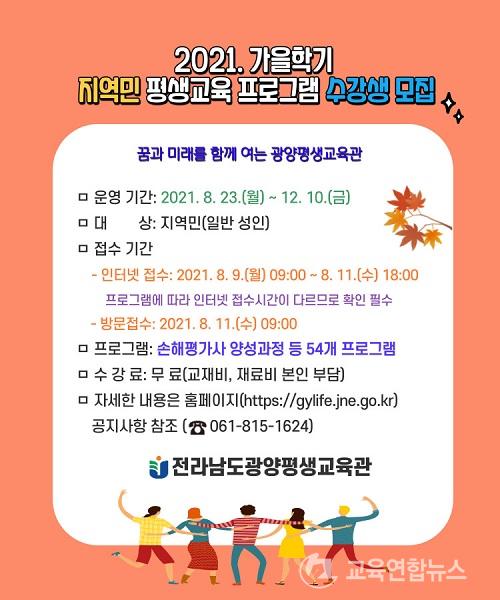 ¡¼±¤¾ç=±³À°¿¬ÇÕ´º½º¡½ÀÌ¿µÁö±âÀÚ= Àü¶ó³²µµ±¤¾çÆò»ý±³À°°ü(°üÀå: ¼±½ÂÇå)Àº 8¿ù 9ÀϺÎÅÍ 11ÀϱîÁö Áö¿ªÁÖ¹ÎÀ» ´ë»óÀ¸·Î ¡®2021³â °¡À»Çбâ Áö¿ª¹Î Æò»ý±³À° ÇÁ·Î±×·¥¡¯ ¼ö°»ýÀ» ¸ðÁýÇÑ´Ù.