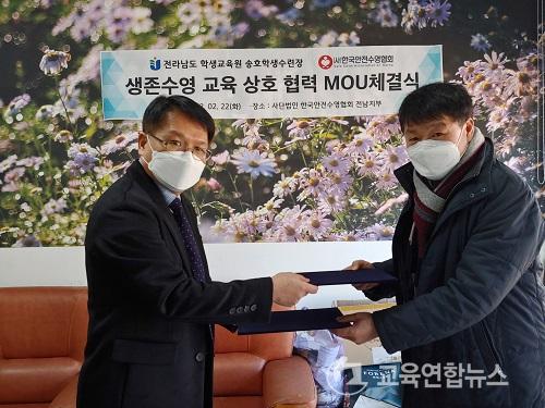ÇлýµéÀÇ ¼ö»ó ¾ÈÀü»ç°í ¿¹¹æÀ» À§ÇØ ¾ÕÀå¼´Â Àü¶ó³²µµÇлý±³À°¿ø ¼ÛÈ£Çлý¼ö·ÃÀå°ú (»ç)Çѱ¹¾ÈÀü¼ö¿µÇùȸ´Â ¡®ÀÙ»õ¶ß±â¡¯ »ýÁ¸¼ö¿µÀ» Àü³²ÀÇ Çлýµé¿¡°Ô ÇÔ²² º¸±ÞÇϱâ·Î ÇÏ°í ±³À° Çù¾àÀ» ¸Î¾ú´Ù.