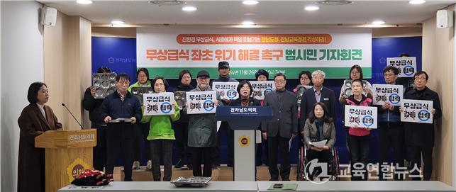 ¶ÇÇÑ"¹«»ó±Þ½ÄÀº ´Ü¼øÈ÷ ¡®¾ÆÀÌµé ¹ä ÇÑ ³¢ °øÂ¥·Î ¸ÔÀÌÀÚ¡¯´Â Á¤Ã¥ÀÌ ¾Æ´Õ´Ï´Ù. ¹«»ó±Þ½ÄÀº ¿ì¸® »çȸÀÇ ¹Ì·¡ÀÌÀÚ Èñ¸ÁÀÎ ¾ÆÀ̵éÀÌ Çб³¿¡¼ Â÷º°¹ÞÁö ¾Ê°í, °Ç°ÇÏ°Ô ¼ºÀåÇÒ ±Ç¸®¸¦ º¸ÀåÇÏ´Â Á¤Ã¥À̸ç, Áö¿ªÀû Ư¼º¿¡ ÀÇÇØ Â÷º°µÇ¾î¼´Â ¾È µÇ´Â º¸ÆíÀûÀÎ º¹ÁöÁ¦µµÀ̸ç Àü³²µµÃ»°ú Àü³²±³À°Ã»ÀÇ °øµ¿°úÁ¦ÀÌ´Ù"¸é¼ "ÇöÀç Àü³²µµÃ»°ú Àü³²±³À°Ã»Àº ¿¹»ê ºÐ´ã ¹®Á¦¸¦ ³õ°í ´ë¸³À» Áö¼ÓÇÏ¸ç º»ÁúÀ» Àذí ÀÖ´Ù"°í ÇÇ·ÂÇß´Ù.