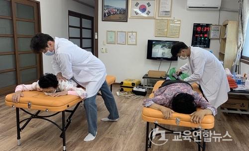 ¹°¸®Ä¡·áÇаú ¡®PTSC¡¯ µ¿¾Æ¸® ÀÌÁ¤¿í Áöµµ±³¼ö´Â û»êµµ ÁÖ¹ÎÀ» ´ë»óÀ¸·Î ÀÏ»ó»ýȰ¿¡¼­ ¿Ã¹Ù¸¥ ÀÚ¼¼ ¹× À¯¿¬¼º ¿îµ¿À» ±³À°Çϰí, ¿Â¿­ ¹× Àü±âÄ¡·á¿Í Clinical massage¸¦ ÁøÇàÇß´Ù.