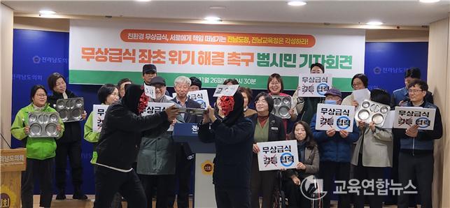 ¶ÇÇÑ"¹«»ó±Þ½ÄÀº ´Ü¼øÈ÷ ¡®¾ÆÀÌµé ¹ä ÇÑ ³¢ °øÂ¥·Î ¸ÔÀÌÀÚ¡¯´Â Á¤Ã¥ÀÌ ¾Æ´Õ´Ï´Ù. ¹«»ó±Þ½ÄÀº ¿ì¸® »çȸÀÇ ¹Ì·¡ÀÌÀÚ Èñ¸ÁÀÎ ¾ÆÀ̵éÀÌ Çб³¿¡¼ Â÷º°¹ÞÁö ¾Ê°í, °Ç°ÇÏ°Ô ¼ºÀåÇÒ ±Ç¸®¸¦ º¸ÀåÇÏ´Â Á¤Ã¥À̸ç, Áö¿ªÀû Ư¼º¿¡ ÀÇÇØ Â÷º°µÇ¾î¼´Â ¾È µÇ´Â º¸ÆíÀûÀÎ º¹ÁöÁ¦µµÀ̸ç Àü³²µµÃ»°ú Àü³²±³À°Ã»ÀÇ °øµ¿°úÁ¦ÀÌ´Ù"¸é¼ "ÇöÀç Àü³²µµÃ»°ú Àü³²±³À°Ã»Àº ¿¹»ê ºÐ´ã ¹®Á¦¸¦ ³õ°í ´ë¸³À» Áö¼ÓÇÏ¸ç º»ÁúÀ» Àذí ÀÖ´Ù"°í ÇÇ·ÂÇß´Ù.
