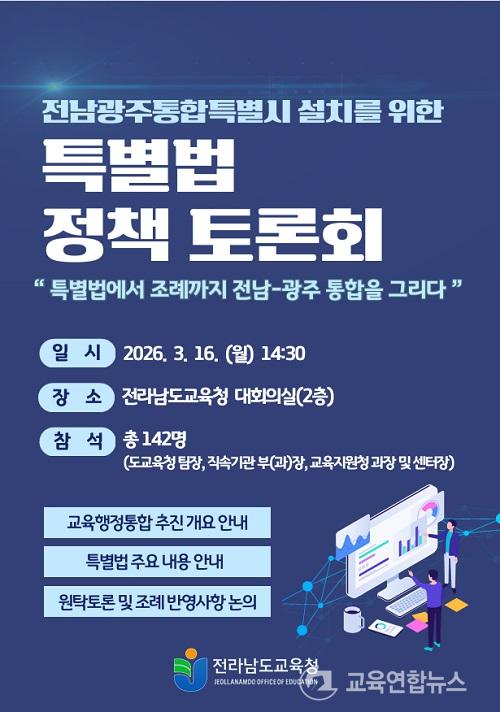 Àü¶ó³²µµ±³À°Ã»Àº ¿À´Â 16ÀÏ(¿ù) û»ç ´ëȸÀǽǿ¡¼ ¡®Æ¯º°¹ý¿¡¼ Á¶·Ê±îÁö, Àü³²¡¤±¤ÁÖ ±³À°ÇàÁ¤ÅëÇÕÀÇ Á¦µµÀû ±âƲÀ» ±×¸®´Ù¡¯¸¦ ÁÖÁ¦·Î Á¤Ã¥Åä·Ðȸ¸¦ °³ÃÖÇÑ´Ù.