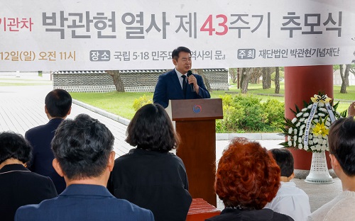 ¡¼±¤ÁÖ=±³À°¿¬ÇÕ´º½º¡½¹Ú»ó¿õ ±âÀÚ= ÀÌÁ¤¼± ±¤Áֽñ³À°°¨ÀÌ 12ÀÏ ±¹¸³5¡¤18¹ÎÁÖ¹¦Áö ¡®¿ª»çÀÇ ¹®¡¯ ¾Õ¿¡¼ ¿¸° ¡®¹ÎÁÖÈÀÇ »õº®±â°üÂ÷ ¹Ú°üÇö ¿»ç Á¦43ÁÖ±â Ã߸ð½Ä¡¯¿¡ Âü¼®Çß´Ù.